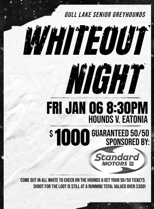 Hounds are back for 2023! Come out Friday for a big match against the Eatonia Huskies with a guaranteed 50/50 courtesy of our friends over at Standard Motors! 🚗 No better way to start off a New Year than with some money in your pocket! Come out in all white to white out the stands, get those 50/50 tickets & cheer the hounds on in the first game of the New Year! ✨ Thanks so much Standard Motors! We hope to see you all there!