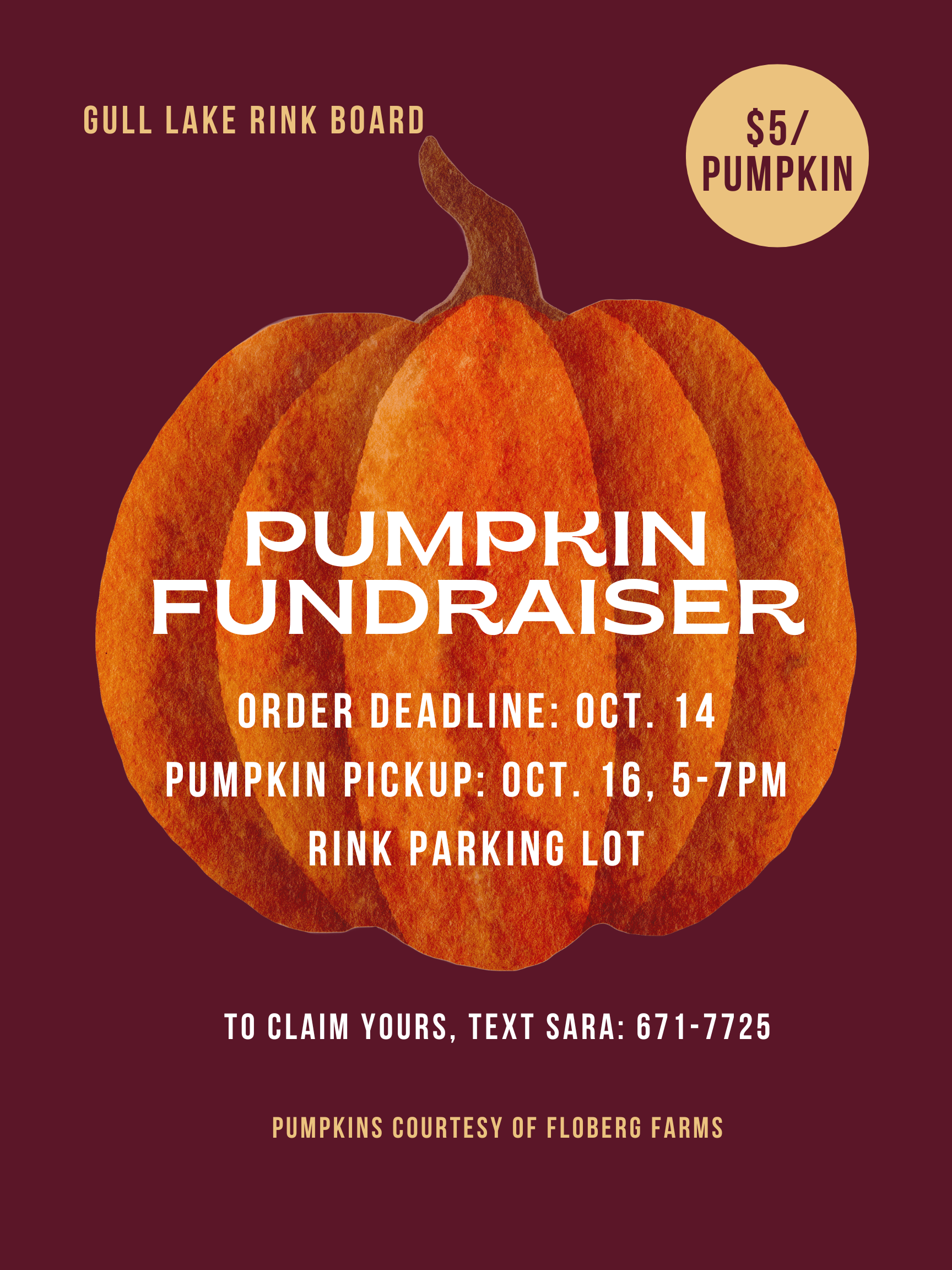 Get your TicketsView PosterContact UsThe Gull Lake Rink Board is selling pumpkins for all your fall carving and decorating needs! $5/pumpkin Text Sara to claim yours: 671-7725 Order deadline: Oct. 14 Pickup: Oct. 16, 5-7pm in rink parking lot